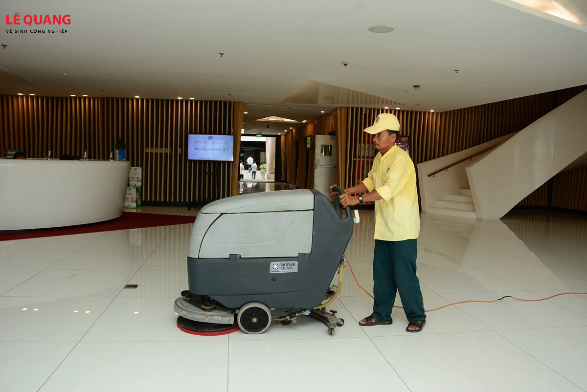 Máy móc chuyên dụng: Đơn vị phải có các thiết bị công suất lớn như máy chà sàn liên hợp, máy hút bụi công nghiệp và máy phun rửa áp lực cao, giúp làm sạch triệt để các vết bẩn cứng đầu (dầu mỡ, sơn, xi măng).