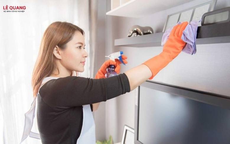 • Làm sạch nội thất: Lau chùi bàn làm việc, tủ hồ sơ, các thiết bị điện tử và hệ thống công tắc điện.