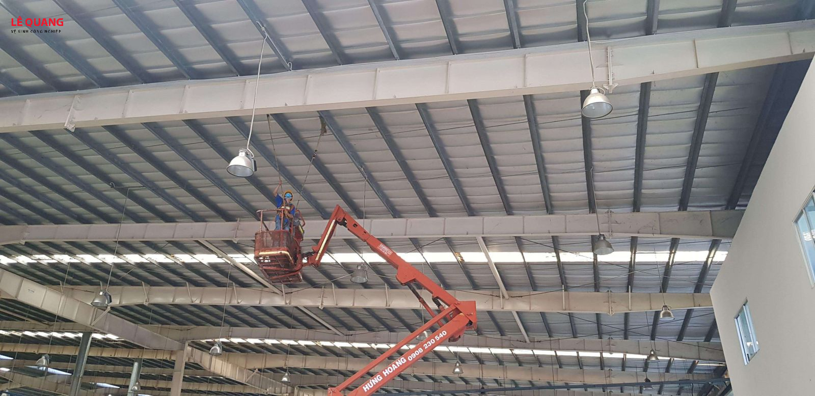 Chúng tôi sử dụng xe nâng người (Boom lift/Scissor lift) hoặc hệ thống giàn giáo an toàn để quét dọn mạng nhện, hút bụi trần nhà, khung kèo thép và hệ thống thông gió. Đây là khu vực quan trọng nhất để phòng chống cháy nổ.