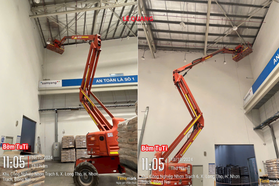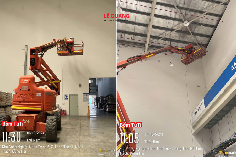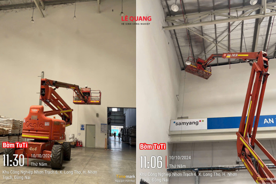 Chúng tôi sử dụng xe nâng người (Boom Lift) kết hợp với máy hút bụi công suất lớn để xử lý triệt để bụi bẩn tại hệ thống mái, kèo thép và thông gió. Việc sử dụng thiết bị chuyên dụng giúp nhân viên tiếp cận các góc khuất một cách an toàn và hiệu quả.
