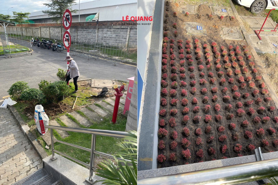 Đất tại các khu công nghiệp thường bị nén chặt và chứa nhiều xà bần. Lê Quang đã tiến hành đào rãnh, loại bỏ tạp chất và thay thế bằng lớp đất hữu cơ tơi xốp, giàu dinh dưỡng giúp hệ rễ cây nhanh chóng bám sâu và phát triển ổn định.