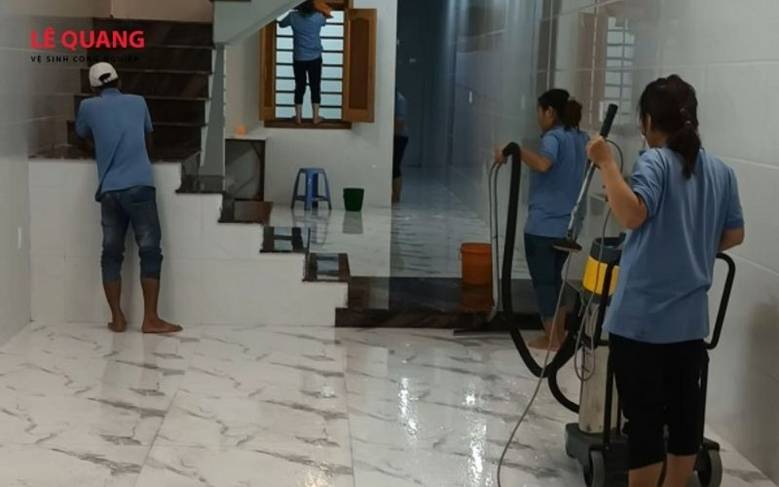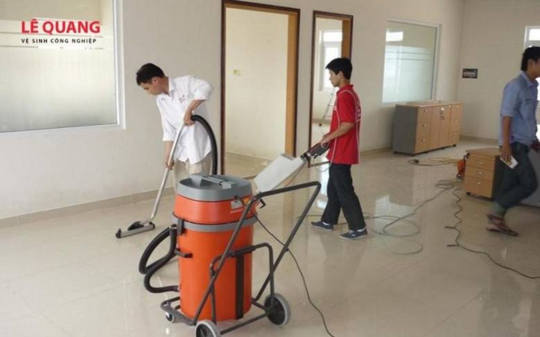 Dựa trên phương án đã thống nhất, Lê Quang điều động đội ngũ nhân viên lành nghề cùng hệ thống trang thiết bị hiện đại (máy hút bụi công suất lớn, máy chà sàn, dụng cụ lau kính...) đến đúng thời gian đã hẹn.